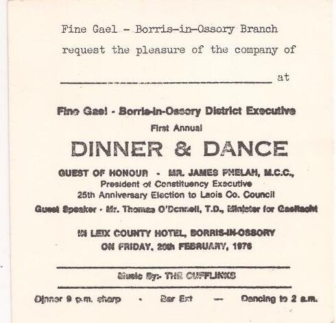 An Invitation to the 1976 Fine Gael Borris in Ossory ‘First Annual Dinner & Dance’ … music by ‘The Cufflinks’ » FGBorris
