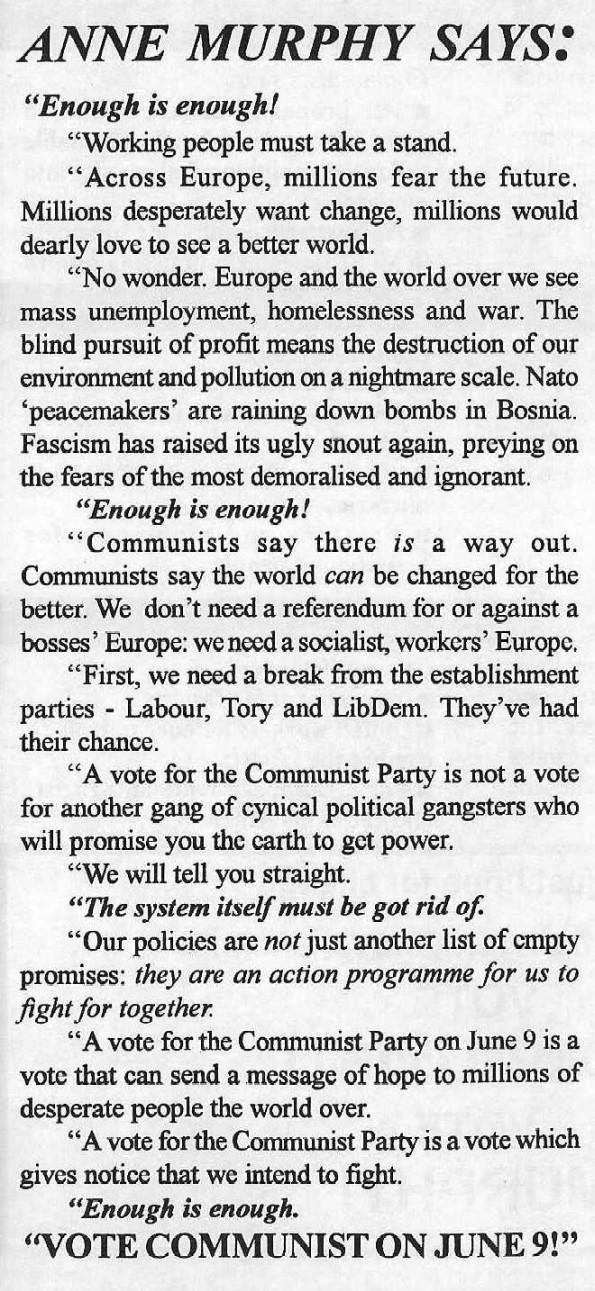 Leaflet from Anne Murphy -Communist Party of Great Britain- 1994 European Elections London NW » 1994MurphySide1a