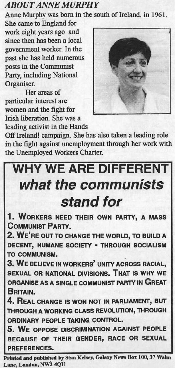 Leaflet from Anne Murphy -Communist Party of Great Britain- 1994 European Elections London NW » 1994MurphySide1b