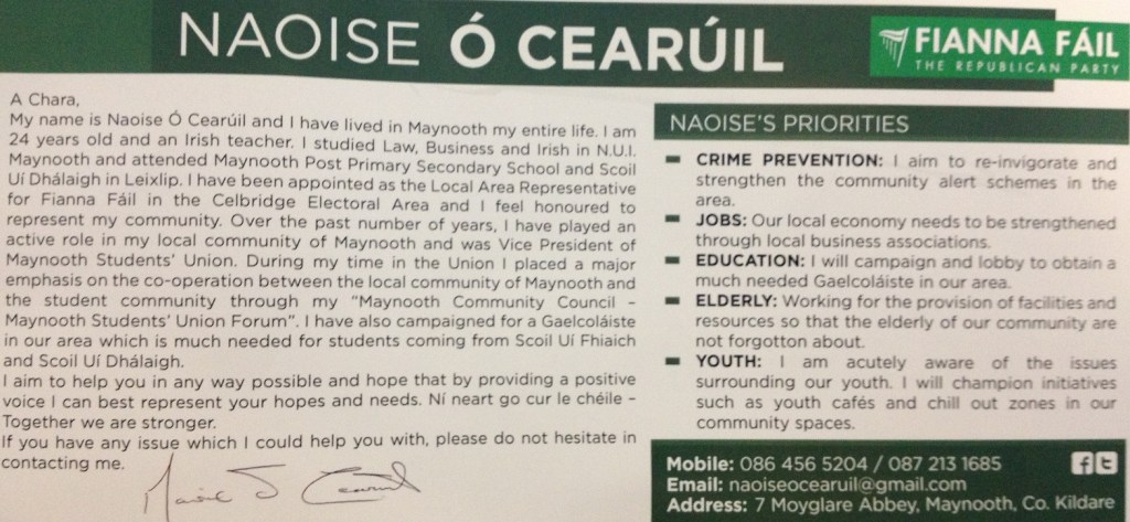 Flyer from Naoise Ó Cearúil -Fianna Fail -Maynooth Local Area Rep » naoiseoc2