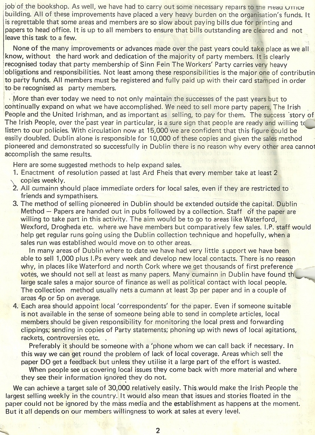 From December 1977 “Sinn Fein The Workers Party ‘Notes & Comments’ ” a newsletter for members outlining various party issues . There are suggested ways of raising funds via extra newspaper sales. The roles of party branches is discussed, The new printing press is mentioned as are the forthcoming European Elections and other matters.