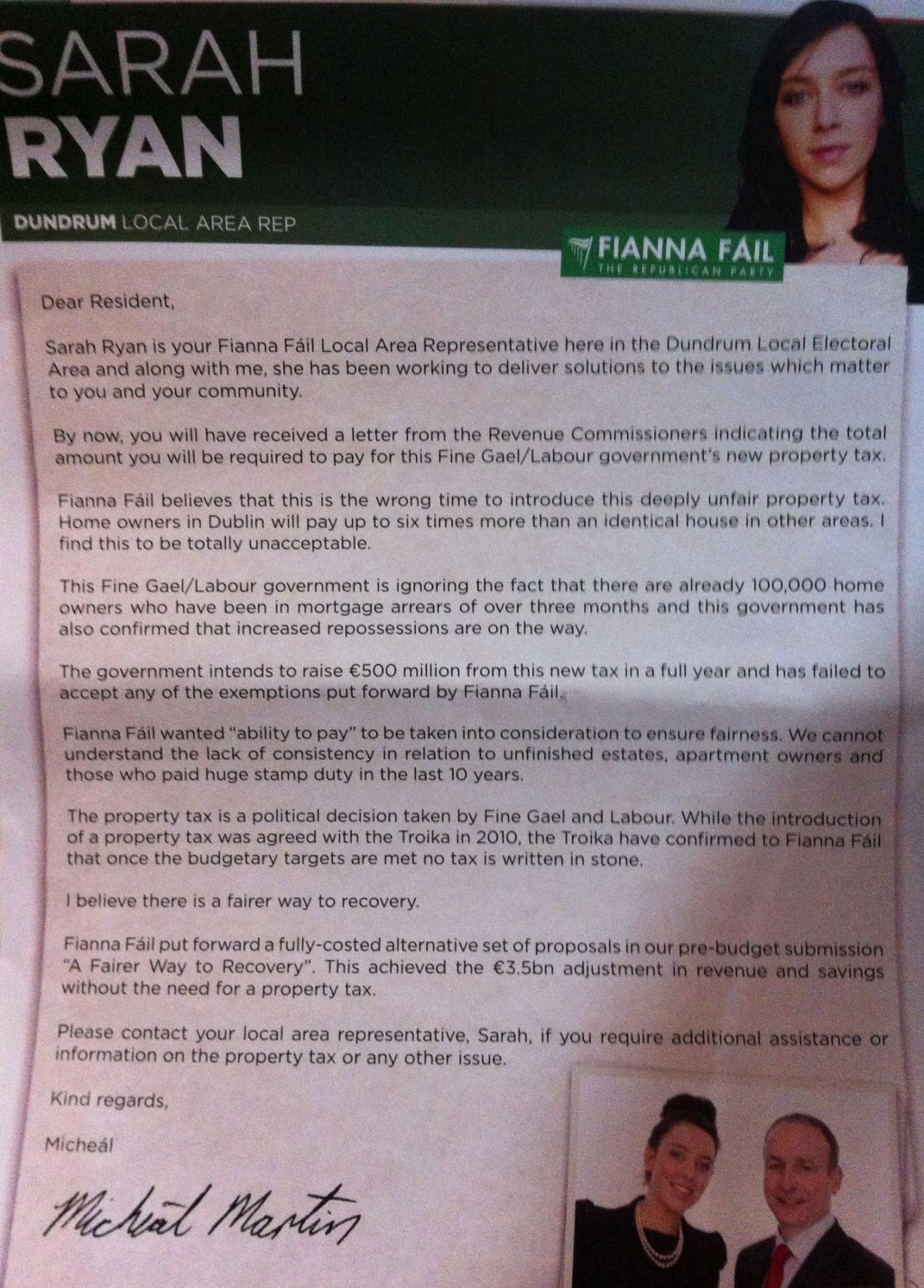 Leaflet from Fianna Fail Dundrum Local Area Rep Sarah Ryan. » sryan1