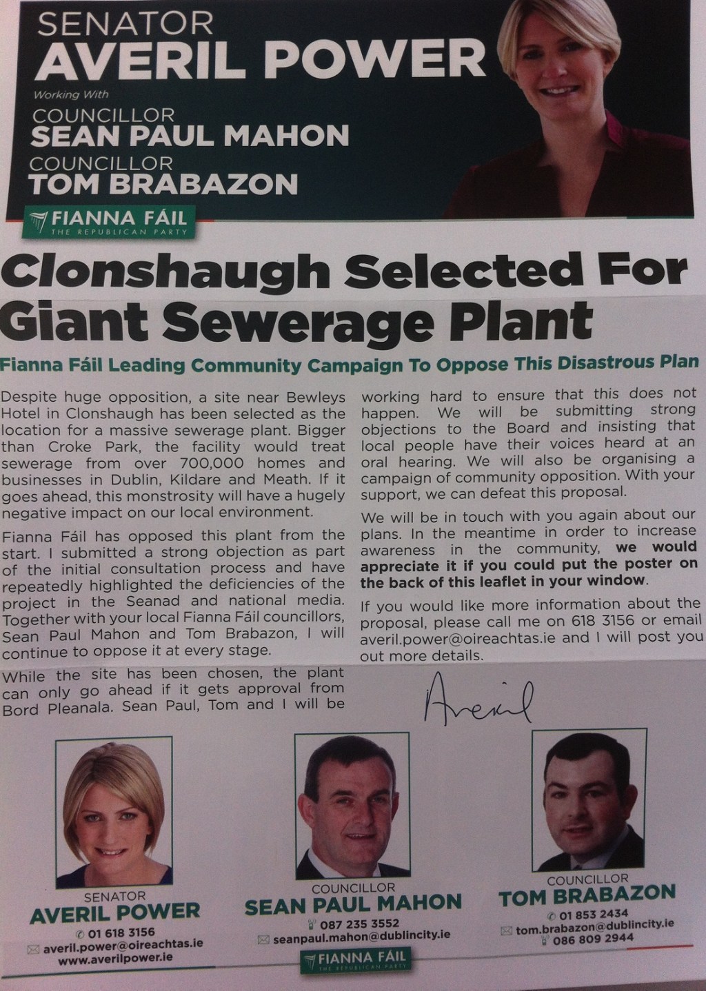 “No Giant Sewerage Plant” Newsletter/Poster from Averil Power, Sean Paul Mahon, Tom Brabazon- Fianna Fail » apowersewrage1