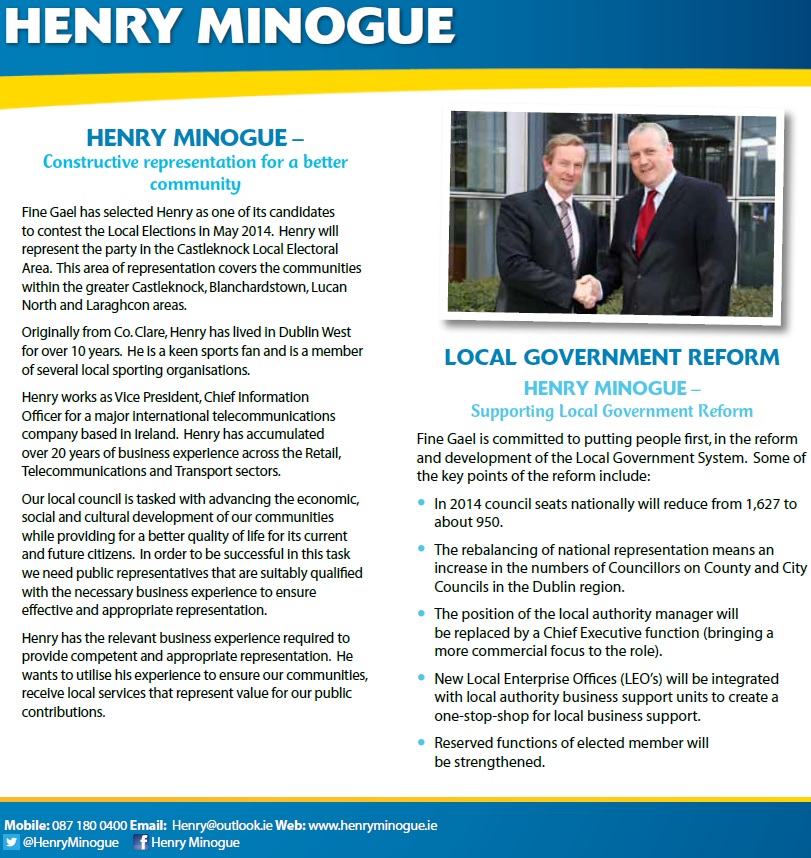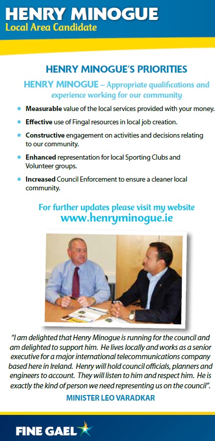 A leaflet from Fine Gael Castleknock Local Election candidate Henry Minogue, introducing himself to voters. It also has a nice endorsement from Leo Varadkar at the back.