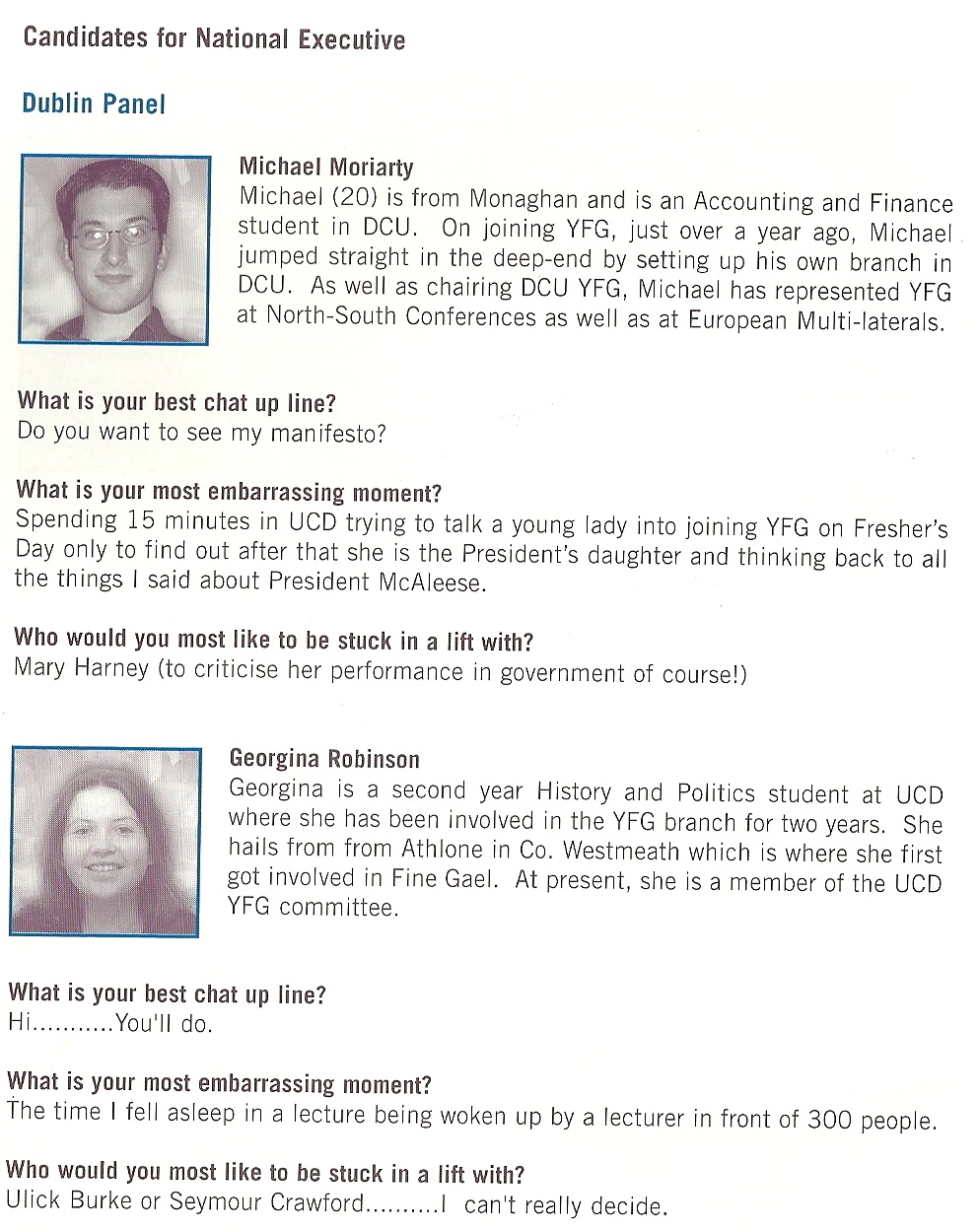 From 2001 Young Fine Gael Conference -Profiles of candidates (includes Lucinda Creightons favourite Chat up line!) » yfgprofile91c