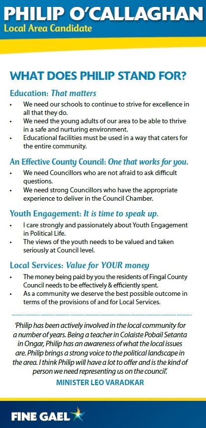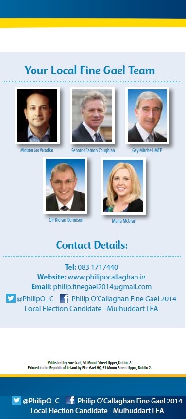 A leaflet from Philip O’Callaghan , a new Fine Gael candidate in the 2014 Local Elections who is running in the Mulhuddart LEA. It gives a background to the candidate, his priorities, what he stands for and other details as he introduces himself to voters.