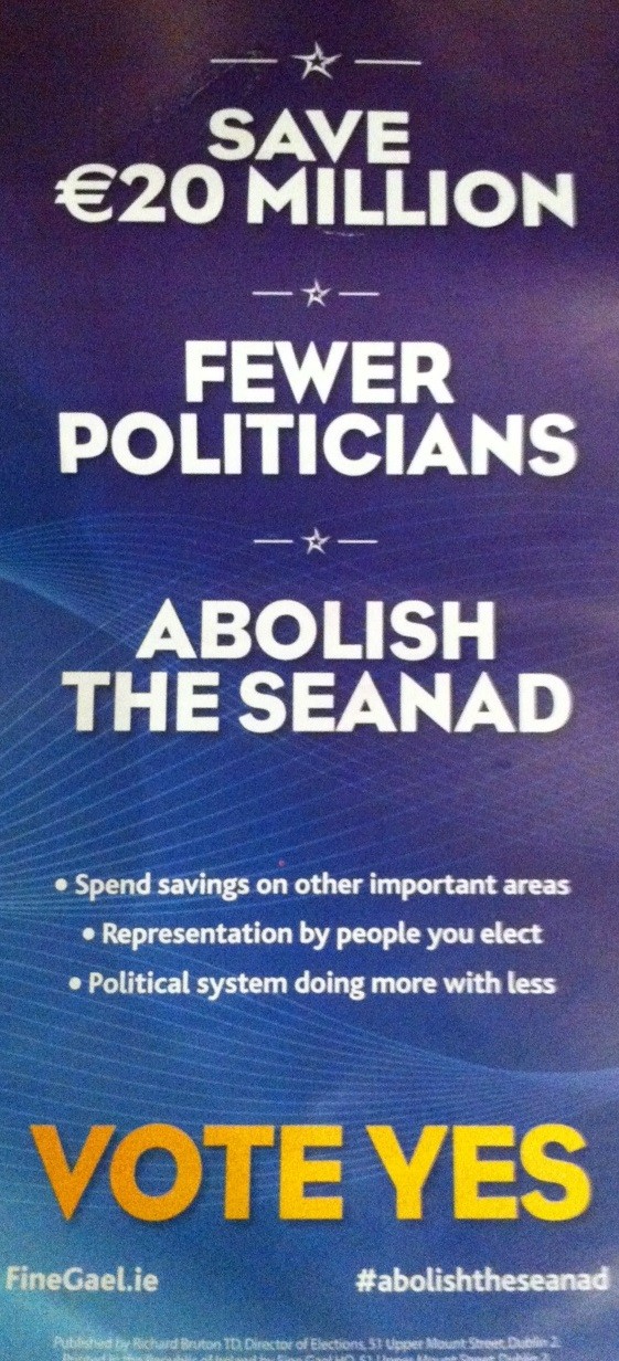 A Flyer for a Richard Bruton meeting on the Seanad Referendum to be held on the 5th September 2013 in the Marino Institute. The flyer also briefly outlines Fine Gaels points of arguement.