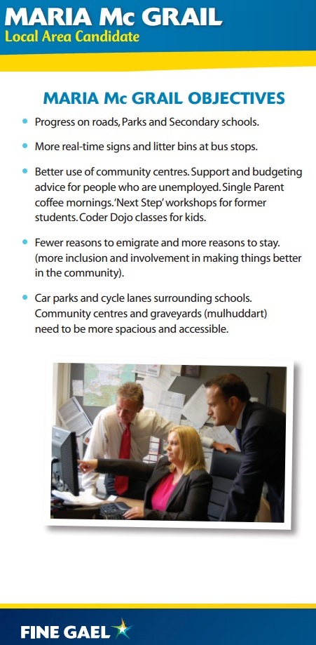 A leaflet from Fine Gael candidate Maria McGrail who is running in Mulhuddart in the 2014 Local Elections. The leaflet gives an introduction to herself and her background as welll as her objectives. She contested the 2009 Local Elections in Mulhuddart as an Independent but failed to win a seat.