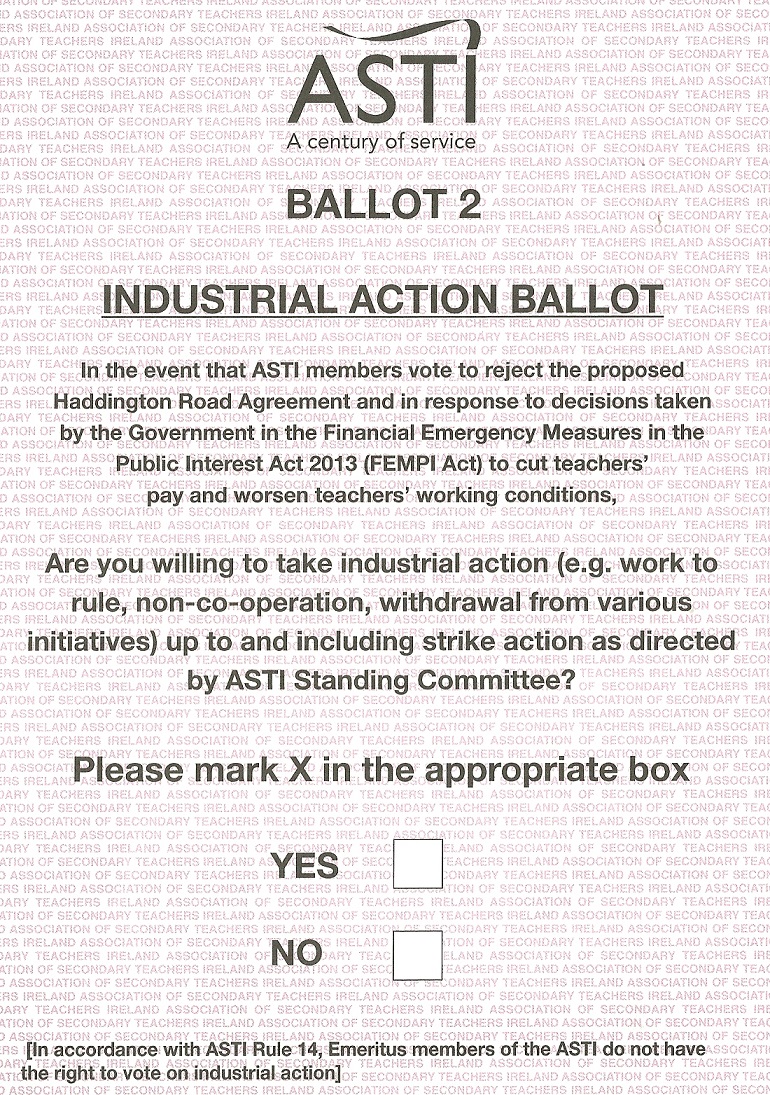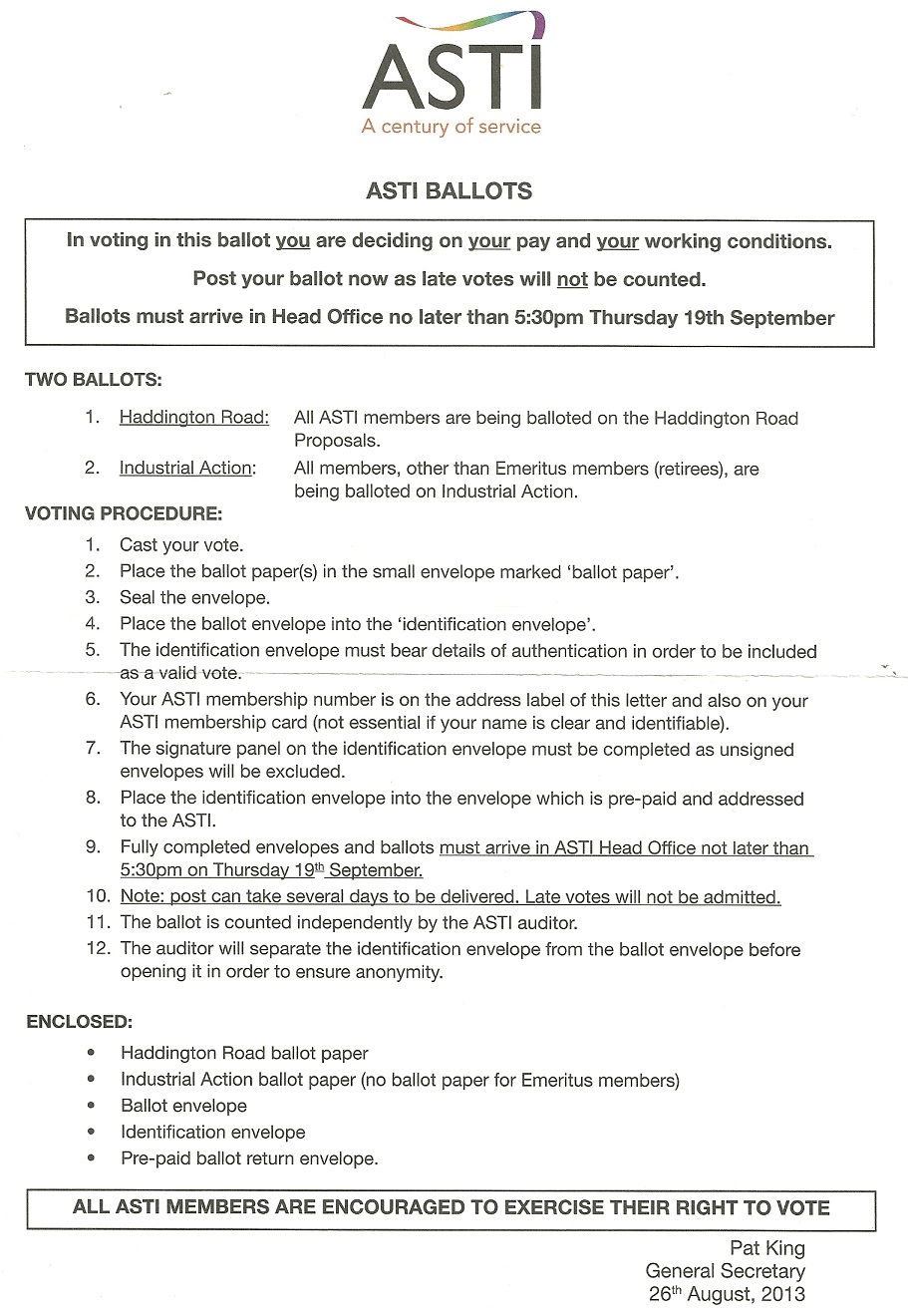 Ballot Papers on the Haddington Road Agreement from the ASTI as well as a letter describing the procedures and so on about the vote. One Ballot is on Industrial Action and the other on the Haddington Road agreement itself.