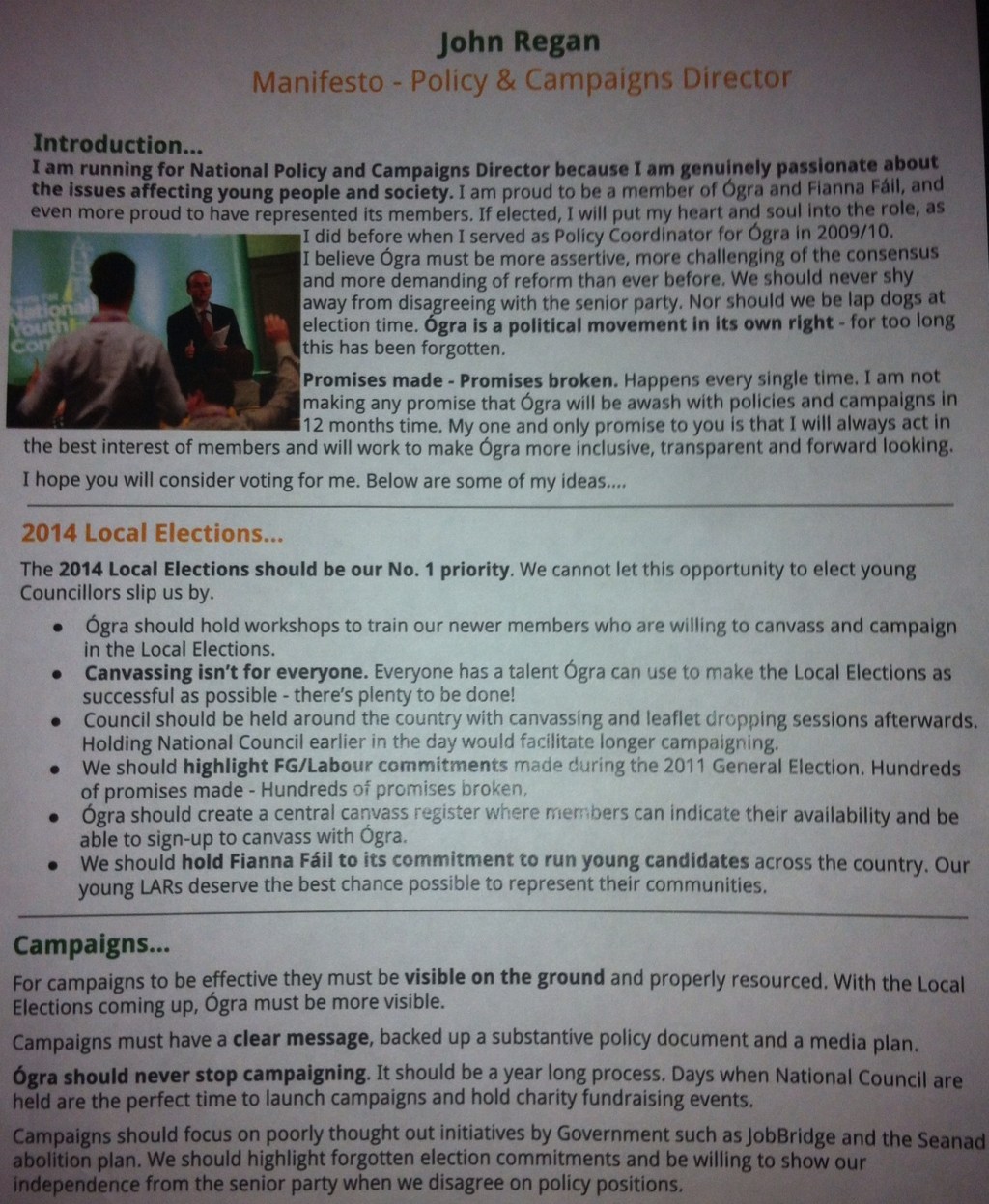 Leaflet from John Regan- by-election for Ogra Fianna Fail policy and campaigns officer » jregan1
