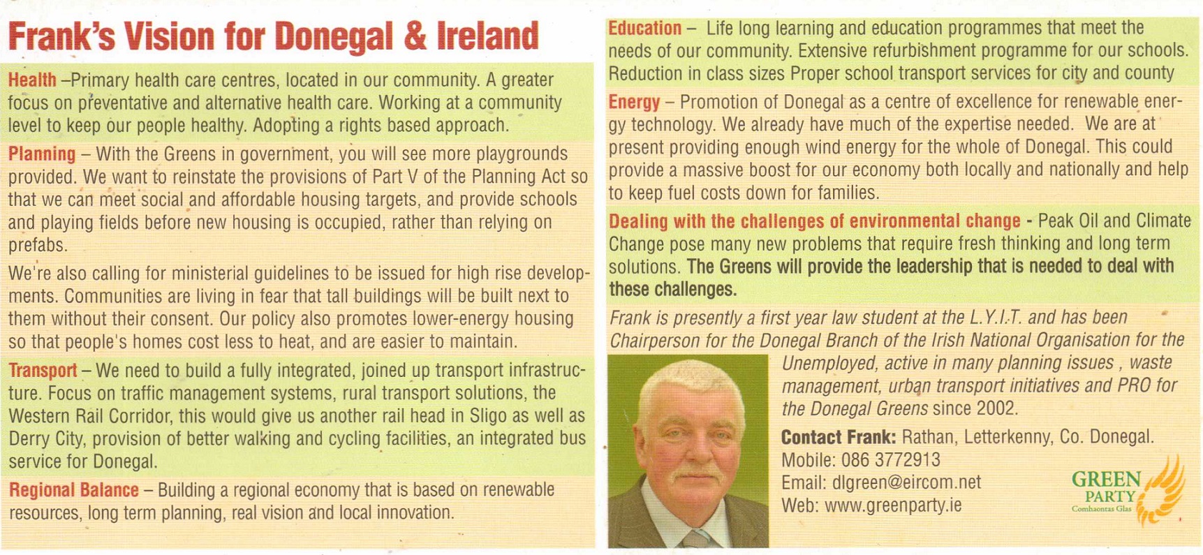 From the 2007 General Election a leaflet from Green Party candidate in Donegal North East Frank Gallagher. Gallagher polled a respectable 520 votes.