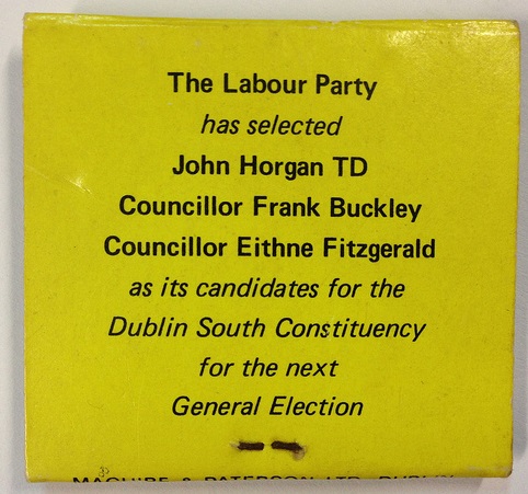 Book of Matches for John Horgan, Eithne Fitzgerald and Frank Buckley- Labour -1981 Dublin South » match81b