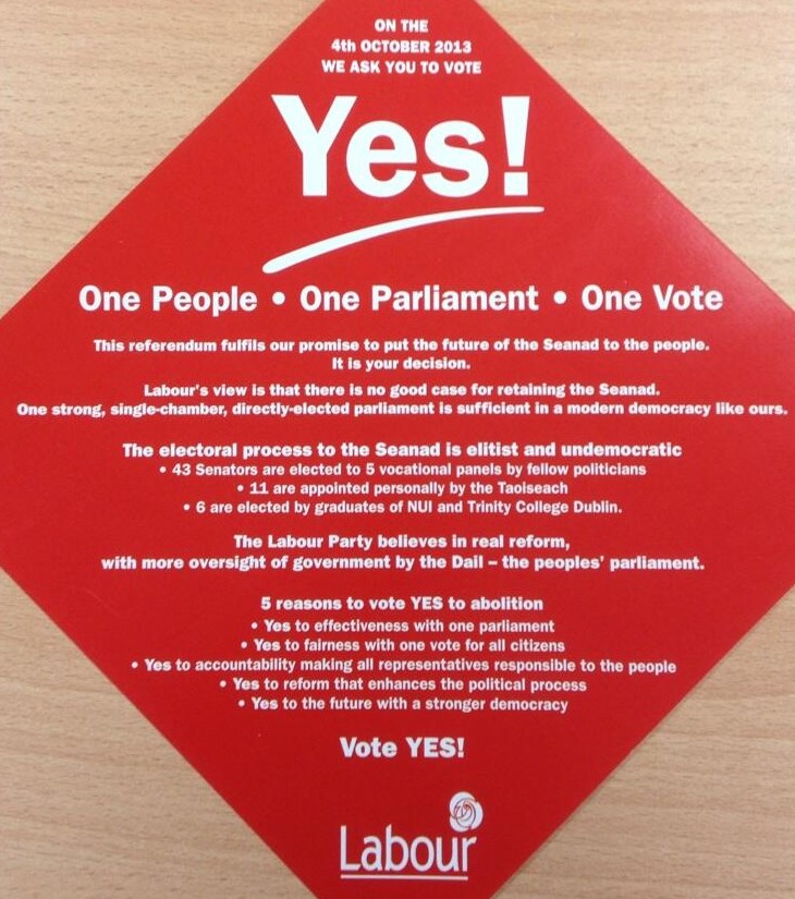 “One People . One Parliament .One Vote -Vote Yes” Labour Party Leaflet for the Seanad and Court of Appeal Referenda » labyes1