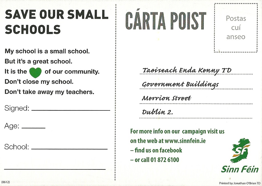 Sinn Fein “Save Our Small Schools” postcard addressed to Enda Kenny » sms1