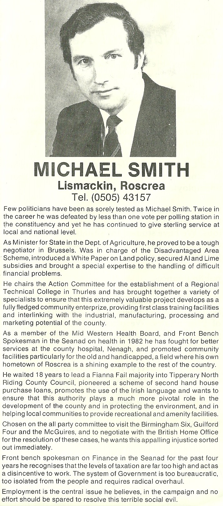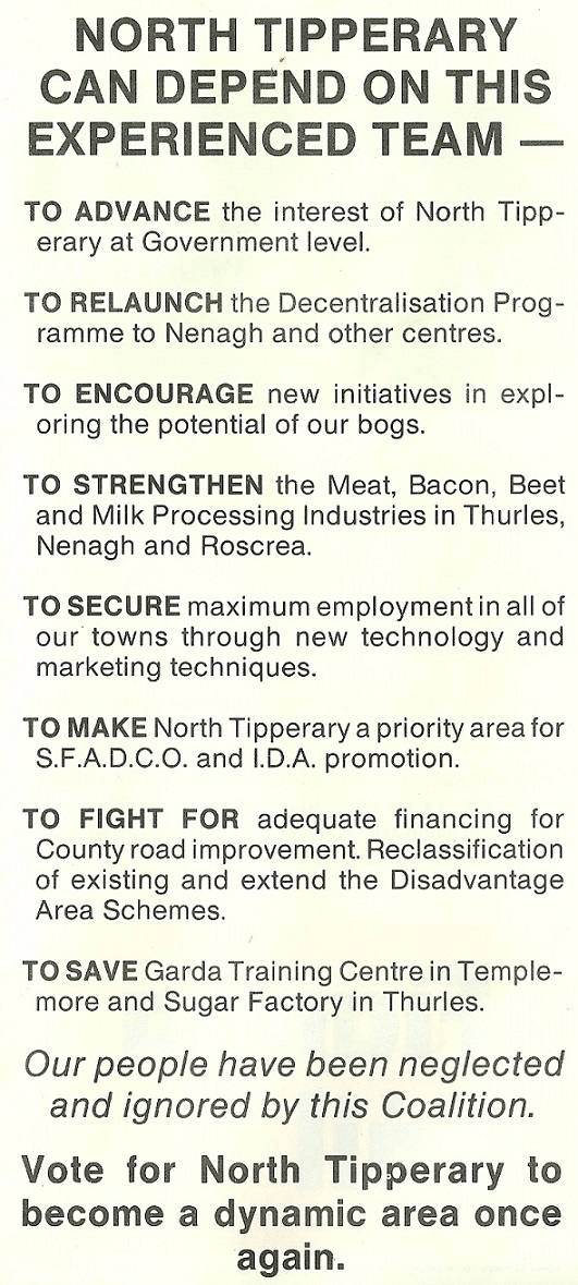 From the 1987 General Election a leaflet from Fianna Fail candidates Michael O’Kennedy and Michael Smith who were both elected in Tipperary North. The Leaflet gives lengthy profiles of the candidates as well as details on how “North Tipperary can depend on this experienced team”. We also have Charles Haugheys message to the Electorate with details of “The Fianna Fail plan for National Recovery”.