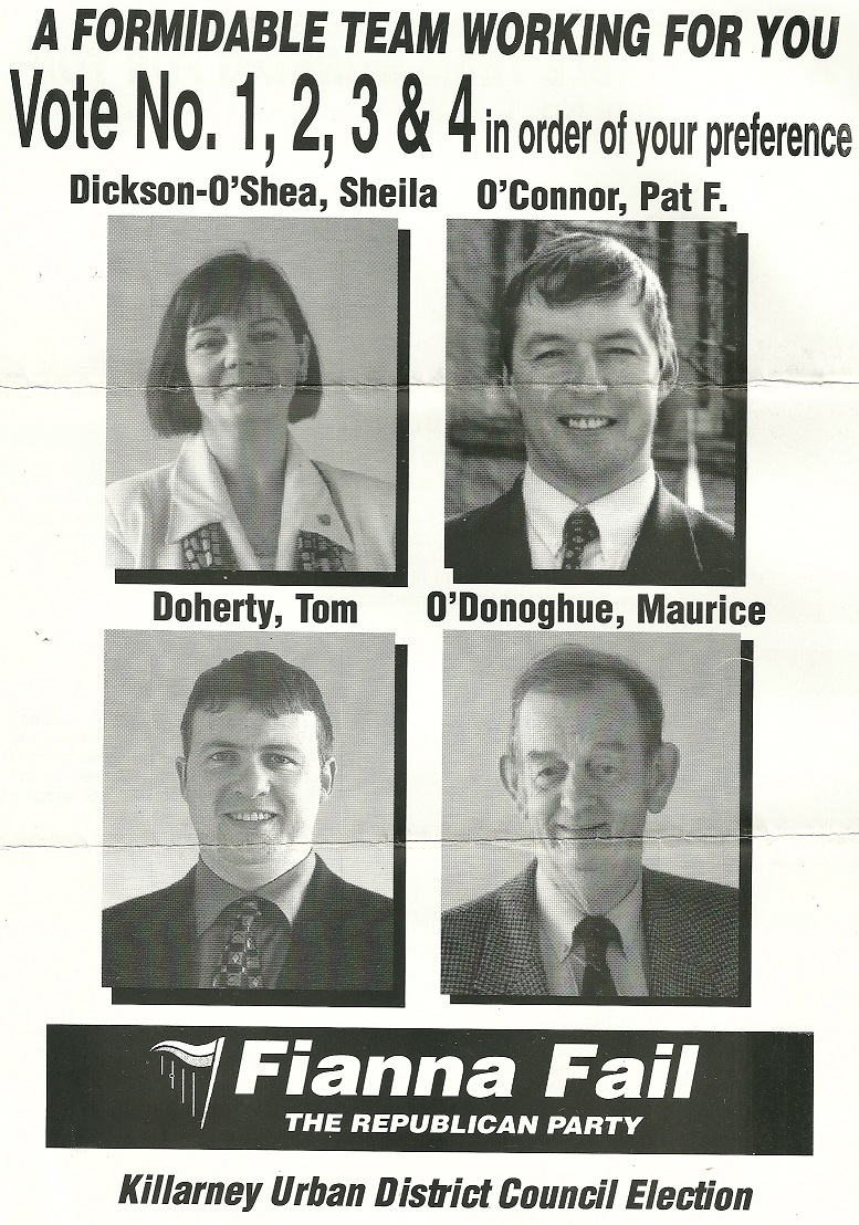 Leaflet for 1999 Killarney UDC Fianna Fail candidates Sheila Dickson-O’Shea, Pat F O’Connor, Tom Doherty, Maurice O’Donoghue » FFKillarneyudc99a