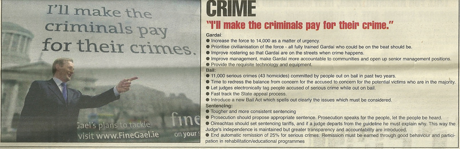 From the 2007 General Election ,”I’ll sack the wasters of taxpayers money.” ,”I’ll make criminals pay for their crimes.” and “I’ll end the scandal of patients on trolleys.” a series of pledges from Enda Kenny from a Fine Gael newspaper ‘Dublin First’ (Dublin West Edition).
