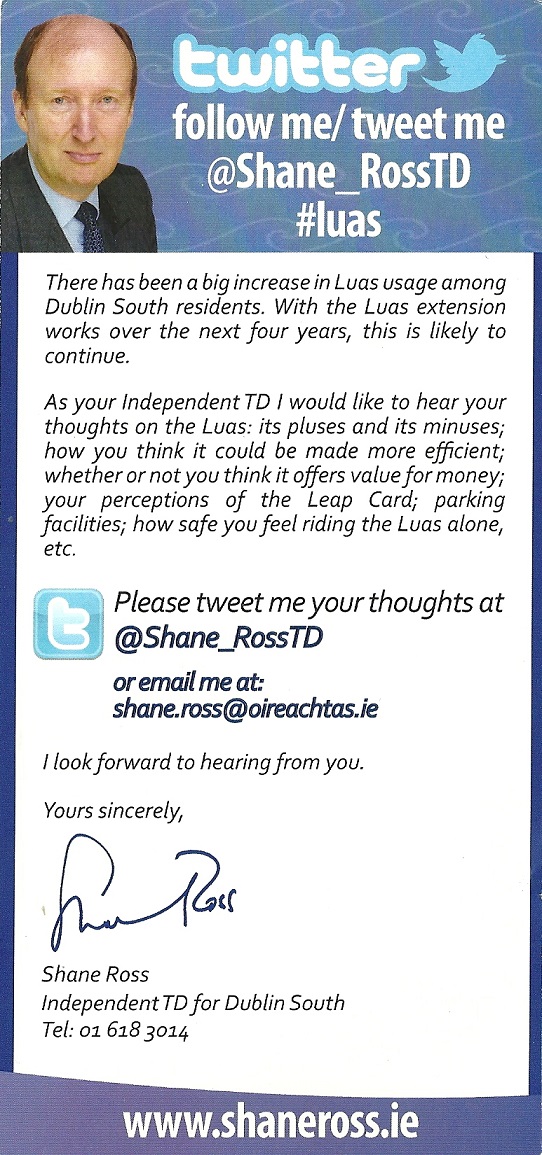 ‘Your thoughts on the Luas’ -flyer from Shane Ross -Independent- Dublin South » srossluas2
