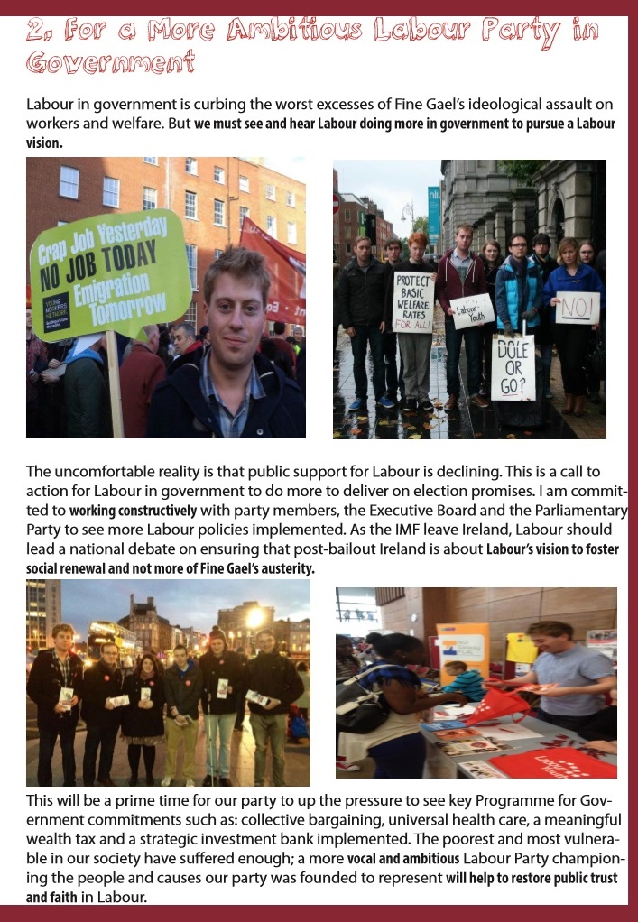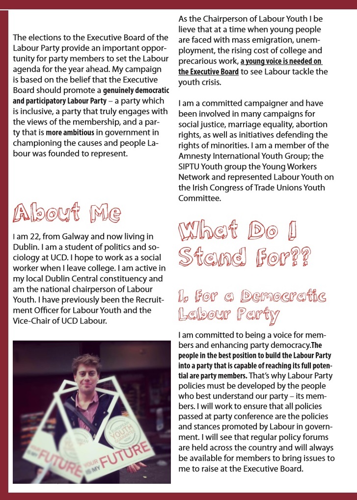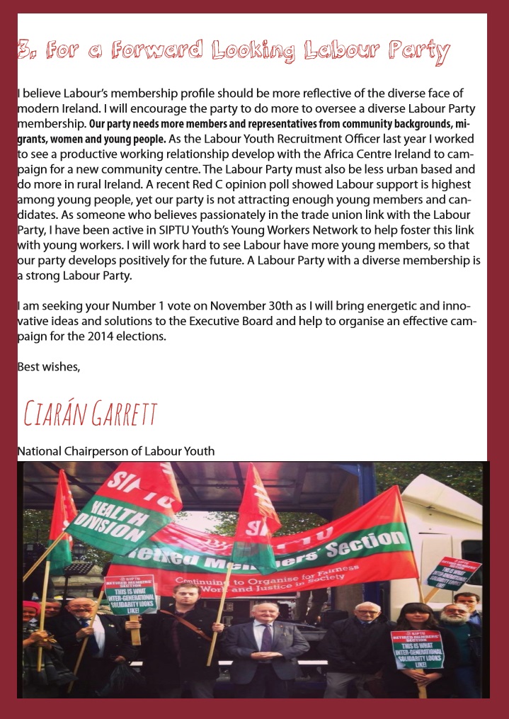From the 2013 Labour Party Conference in Killarney a leaflet from Ciarán Garrett who is running for a seat on the partys Executive Board.