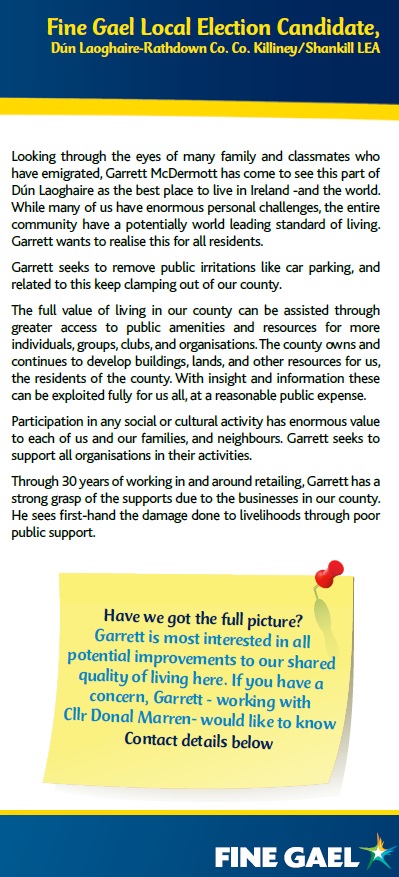 Leaflet from Garrett McDermott -Fine Gael -Killiney-Shankill 2014 Local Elections » gmcdermott13c