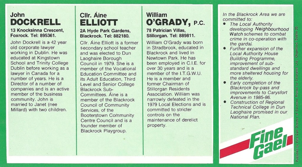 Leaflet for John Dockrell, Aine Elliot, William O’Grady -Fine Gael -Blackrock -1985 Local Elections » fgblackrock85b