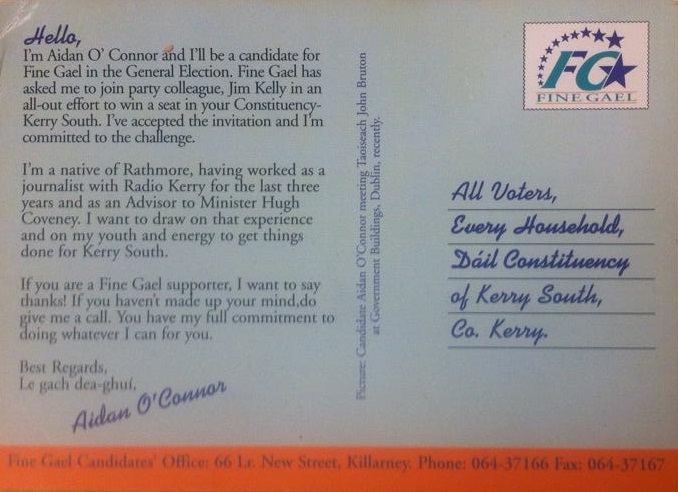 “Hello!” magazine style canvass card from Aidan O’Connor -Fine Gael -Kerry South -1997 General Election » hello2