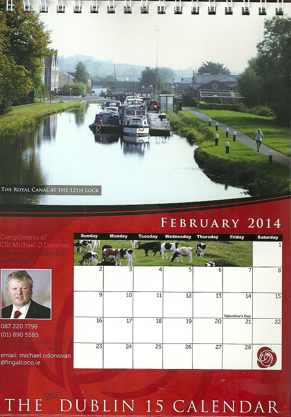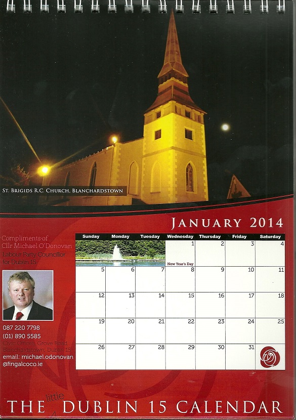 A calendar produced by Labour councillor for Mulhuddart Michael O’Donovan “The Little Dublin 15 Calendar”. The Calendar has a different page for each month each with a photo from Dublin 15. Major dates are also marked in along with some religious festivals such as Palm Sunday. No mention of a date for the Local Elections next year though!