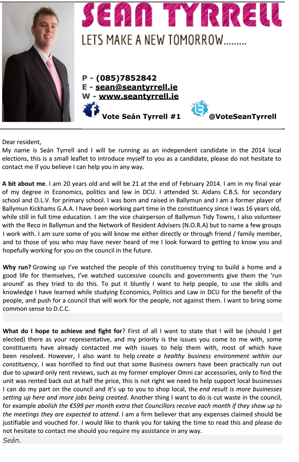 Leaflet introducing himself to voters from Seán Tyrrell -Independent -Ballymun » styrelldoc