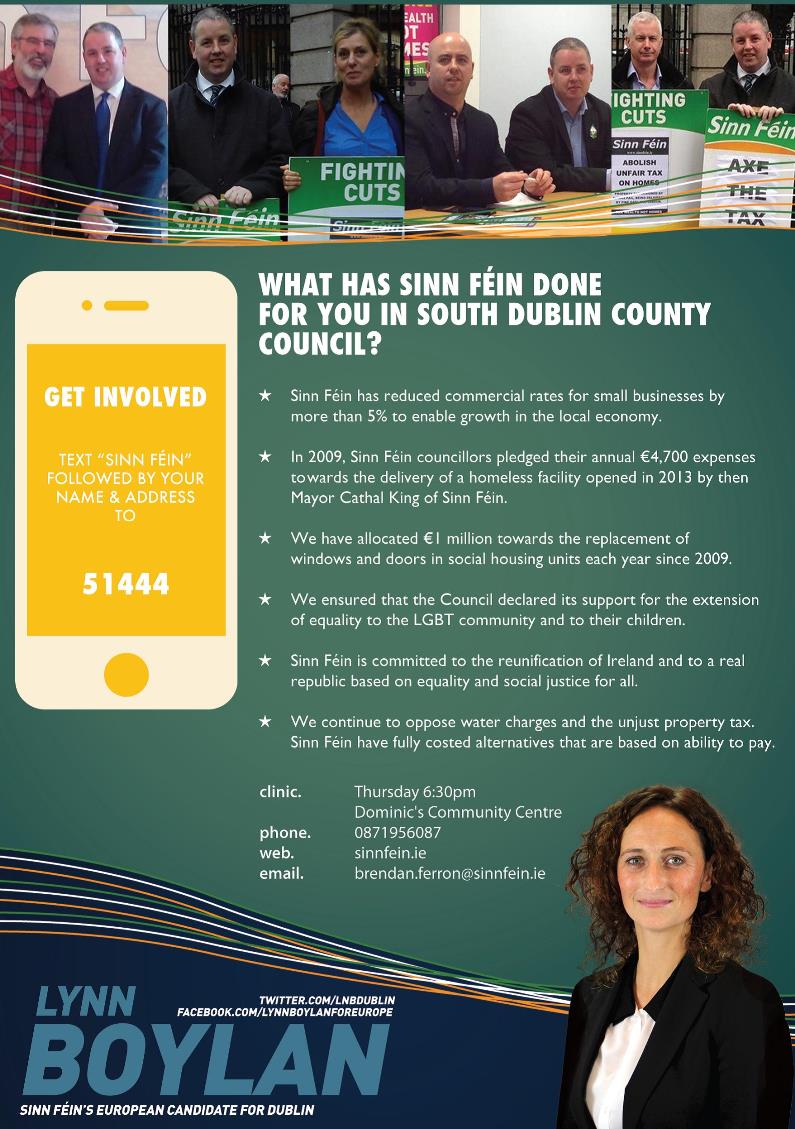 A leaflet from Brendan Ferron who is running for Sinn Fein in Tallaght Central in the 2014 Local Elections. He previously ran in 2004 in Tallaght South receiving 1,469 votes and narrowly missing out on a seat. The Leaflet also asks for a vote for Lynn Boylan the Sinn Fein Dublin candidate in the European Elections.