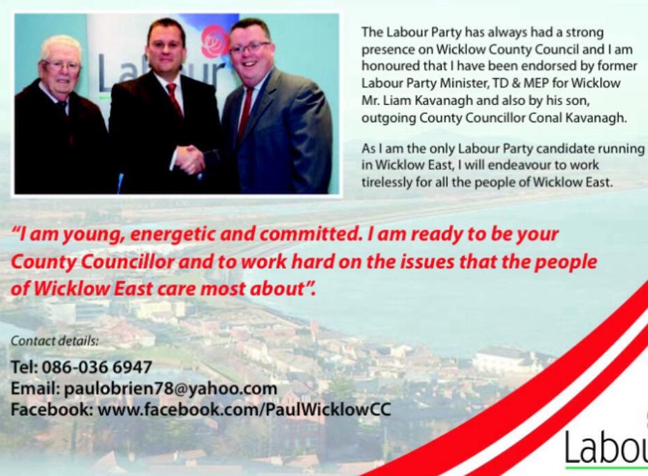 A leaflet from Labour Party candidate Paul O’Brien who is running in the Wicklow LEA for a seat on Wicklow County Council.