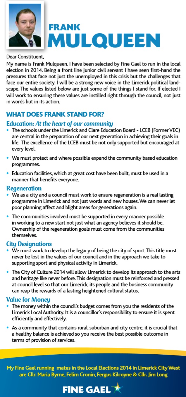 Leaflet from Frank Mulqueen -Fine Gael -Limerick City West – 2014 Local Elections » fmulqueen2