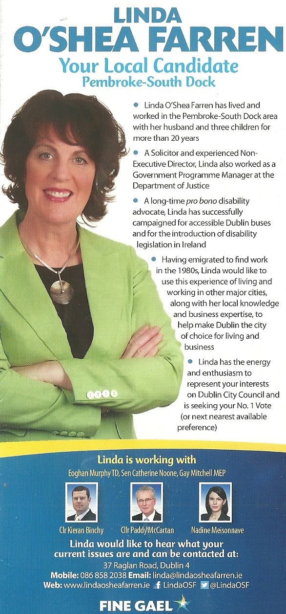 A leaflet from Linda O’Shea Farren who is running for Fine Gael in the Pembroke South Dock Ward for a seat on Dublin City Council. She has previously run on four occasions for the Seanad on the NUI panel.