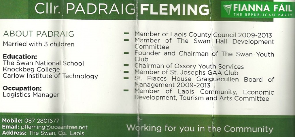 Flyer from Padraig Fleming-Fianna Fail -Graiguecullen-Portarlington -Laois 2014 Local Elections » pfleming2