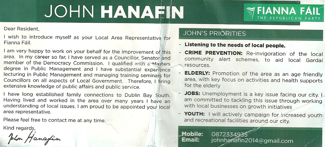 A flyer from former Senator and Tipperary North Riding County Councillor John Hanafin who was hoping for a Fianna Fail nomination in Pembroke South Dock for a seat on Dublin City Council. He has yet to be selected to run.