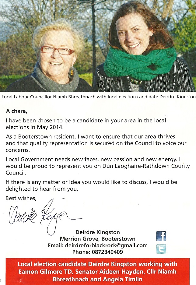 Leaflet from Deirdre Kingston – Labour -Blackrock -2014 Local Elections » dkingston2