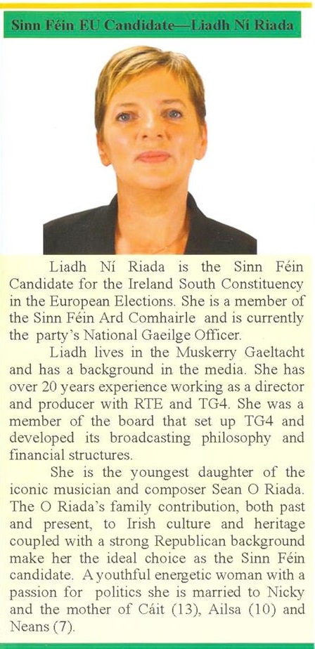 A leaflet from Sinn Fein candidate in Blarney Macroom Des O’Grady who is running for a seat on Cork County Council. There is a profile of Des O’Grady and also the European Elections candidate Liadh Ní Riada.