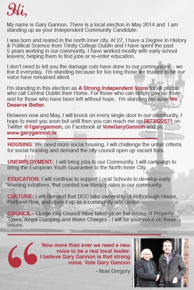 A leaflet from Independent Candidate Gary Gannon who is running in Dublins North Inner City. Although not the Gregory Group candidate, he is endorsed by Noel Gregory , brother of the late Tony Gregory.