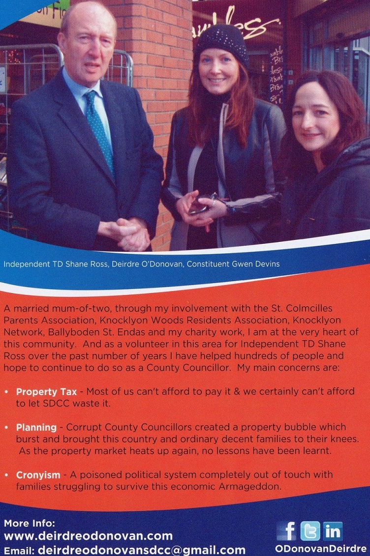 A Leaflet from Independent candidate Deridre O’Donovan who is running in the Rathfarnham Ward. She is endorsed by Shane Ross and involved in his various campaigns.