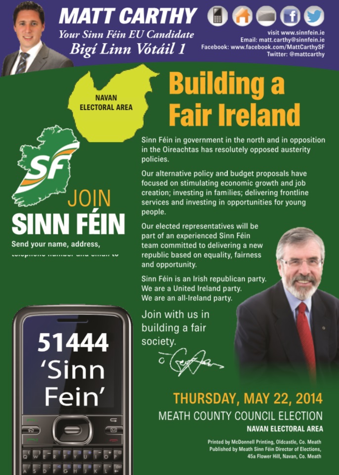 A leaflet from Sinn Fein candidate Sinéad Burke who is running along with colleague Joe Reilly in Navan for a seat on Meath County Council.