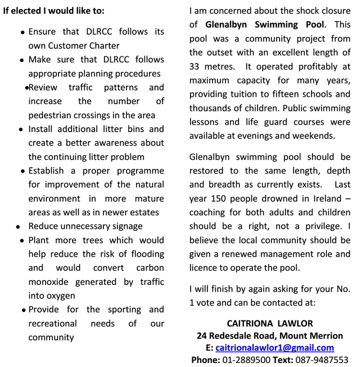Leaflet and poster from Caitriona Lawlor -Independent -Stillorgan -2014 Local Elections » clawlor2b