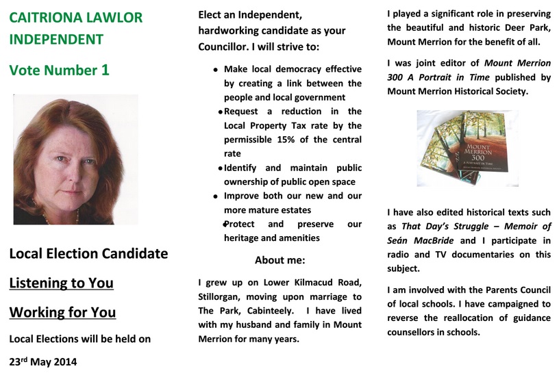 Leaflet and poster from Caitriona Lawlor -Independent -Stillorgan -2014 Local Elections » clawlornew1
