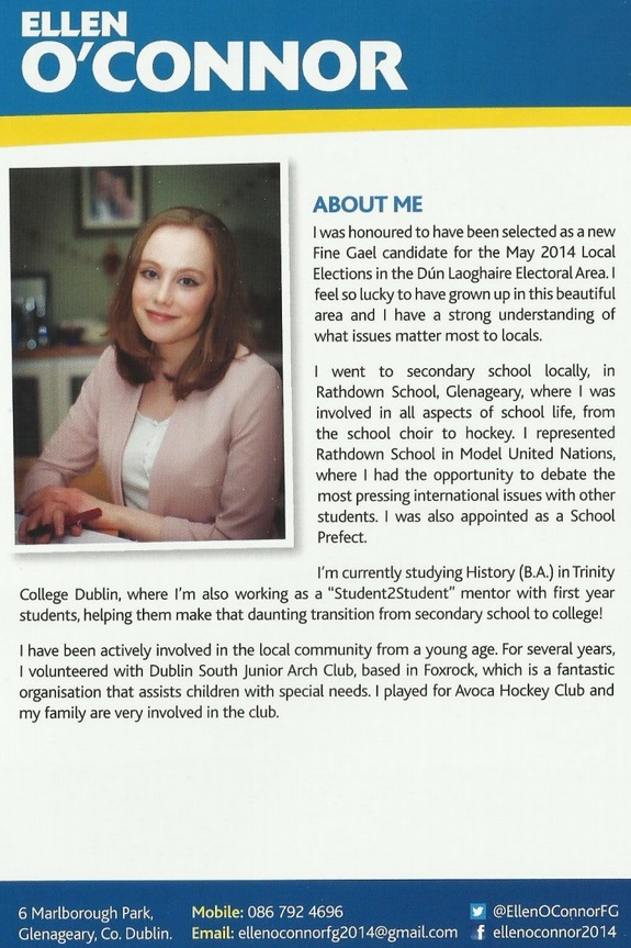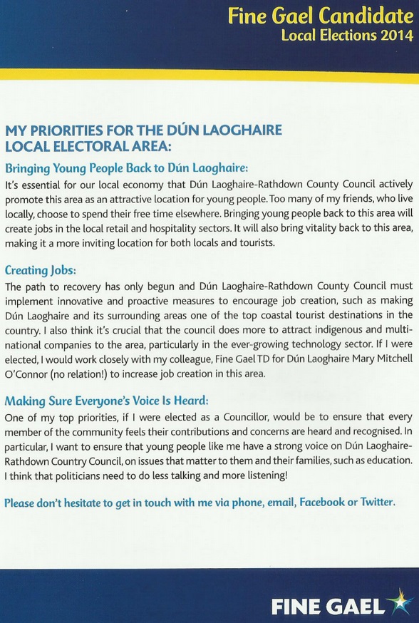 A leaflet from Ellen O’Connor who is running for Fine Gael in Dun Laoghaire.