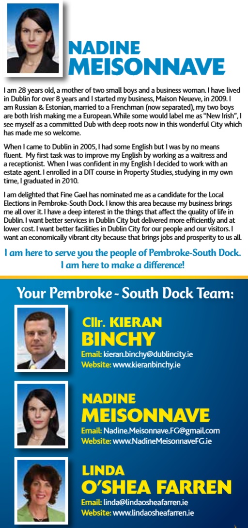 A leaflet from Nadine Meisonnave who is running for Fine Gael in Pembroke South Dock for a seat on Dublin City Council.
