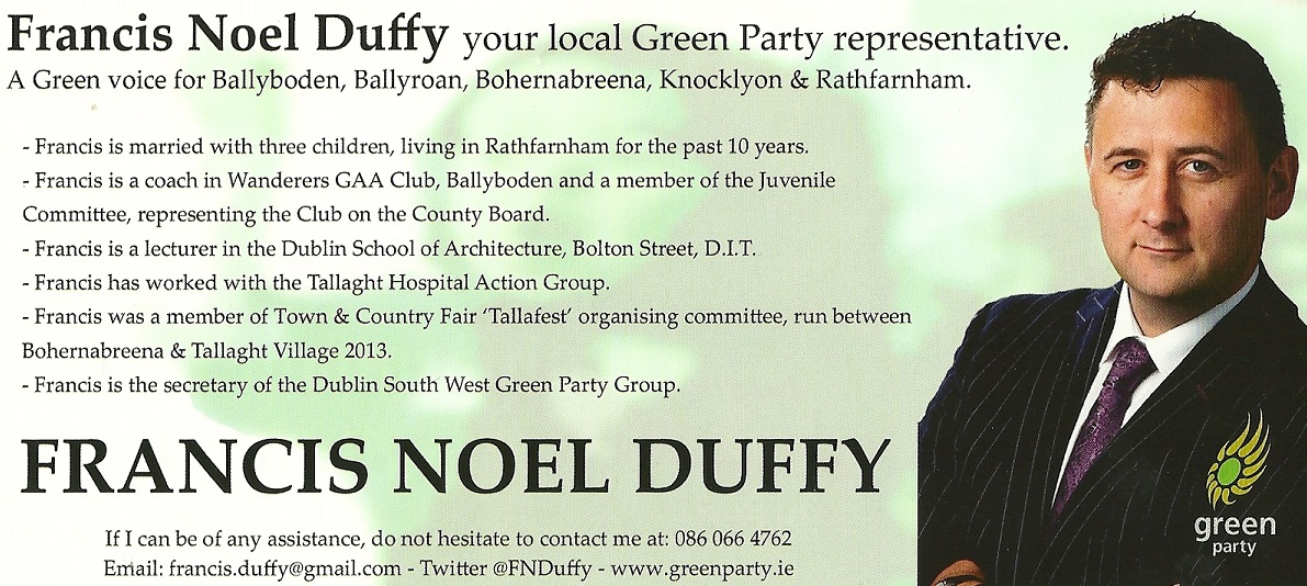 A leaflet from Francis Noel Duffy who is running for The Green Party in Rathfarnham.