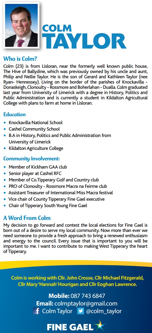 A leaflet with a memorable slogan from Colm Taylor who is running for Fine Gael in Cashel-Tipperary.