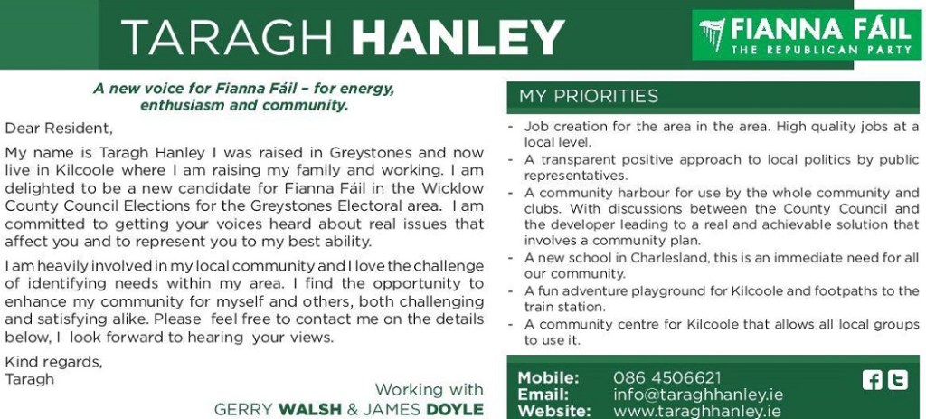 Leaflet from Taragh Hanley -Fianna Fail -Greystones -2014 Local Elections » thanley2