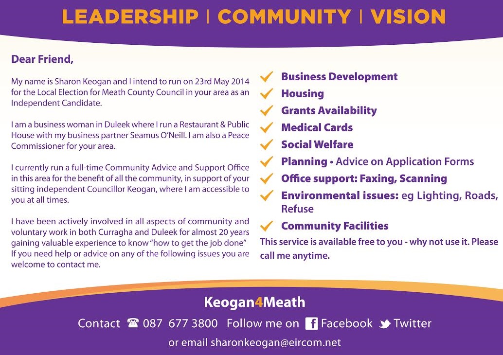 A leaflet from Independent candidate Sharon Keogan who is running in Ashbourne and Laytown Bettystown for a seat on Meath County Council. At present she is the only female candidate standing in two different LEAs.