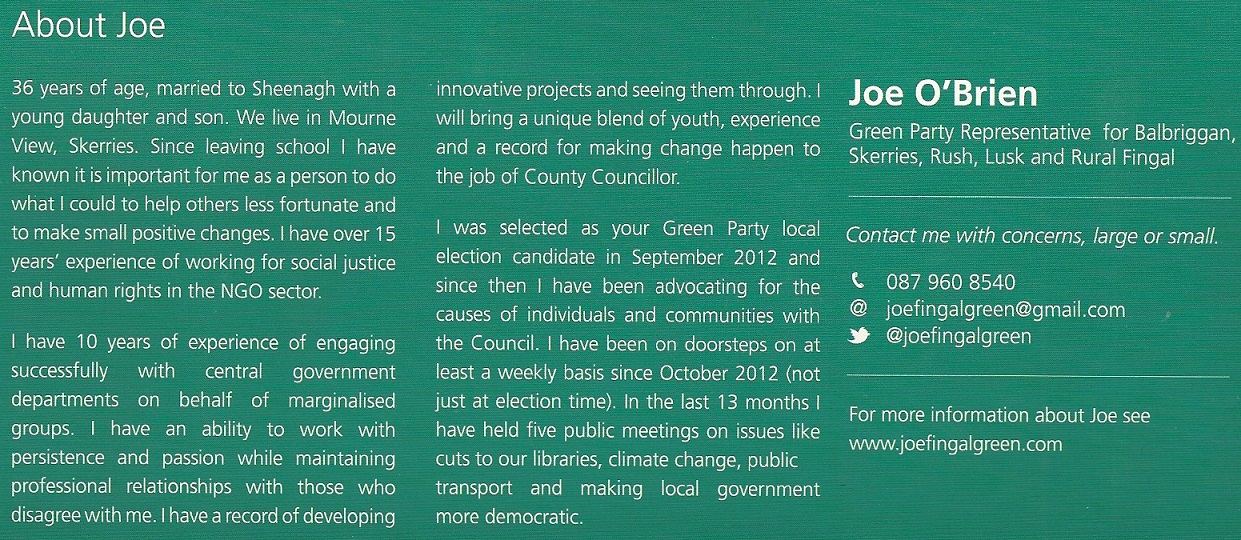 A leaflet from Joe O’Brien who is running for the Green Party in Balbriggan for a seat on Fingal County Council. This leaflet is aimed at the rural population of North Dublin .