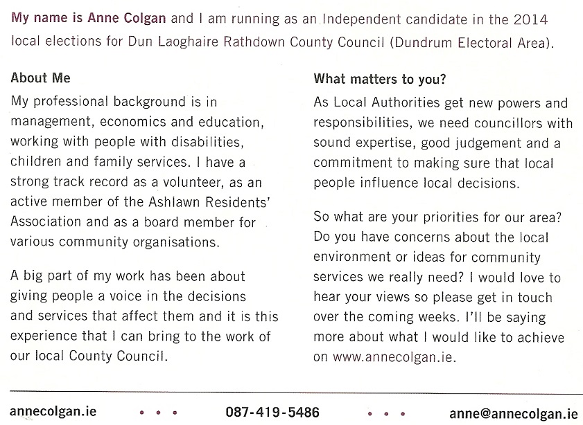 A leaflet from Independent candidate Anne Colgan who is running in Dundrum for a seat on Dun Laoghaire Rathdown County Council.
