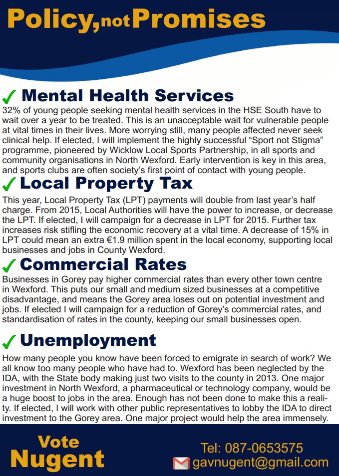 A leaflet from Gavin Nugent, who is running as an Independent in Gorey for a seat on Wexford County Council.